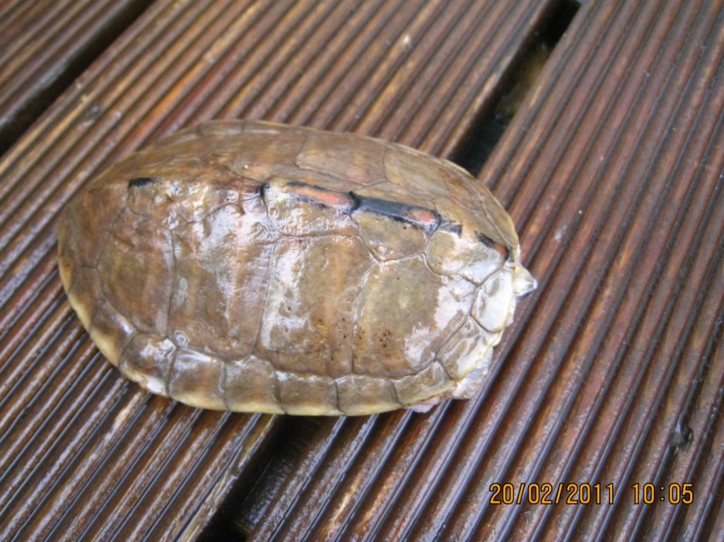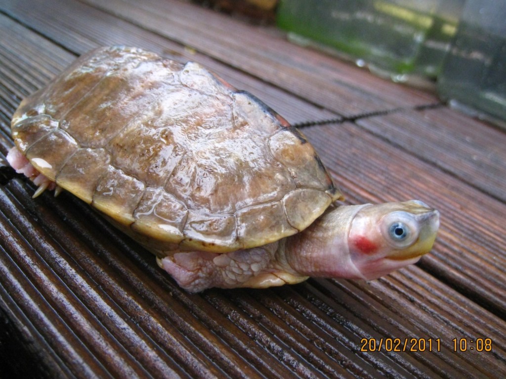 一隻橄欖殼色,配上粉紅色皮膚,兩邊面頰像塗了紅色胭脂的斑紋,再加上一對藍眼睛,這外貌亮麗的龜是史密斯鋸背的亞種Pangshura smithii pallidipes 白足棱背龜/ 白足鋸背龜。