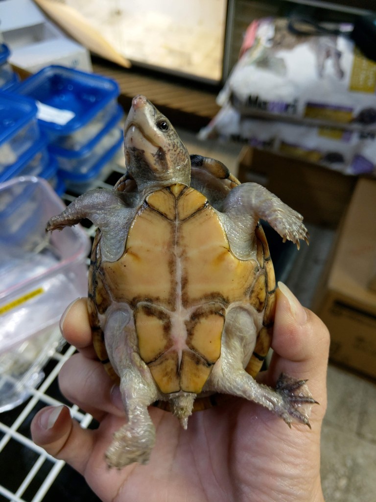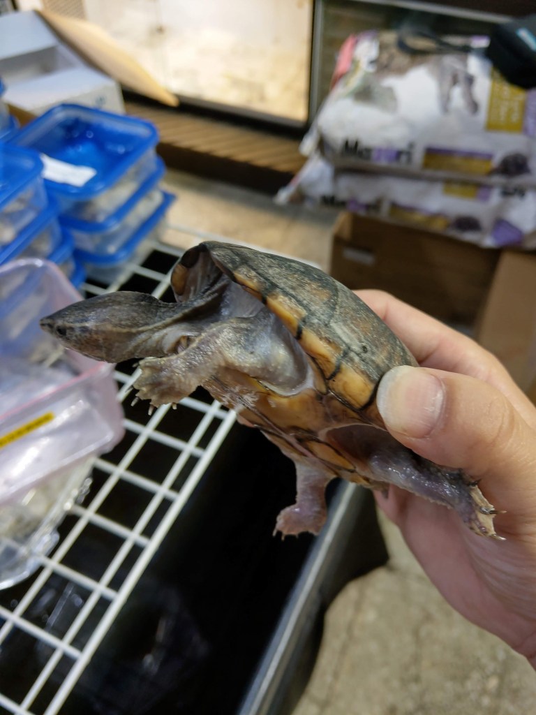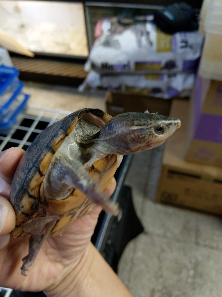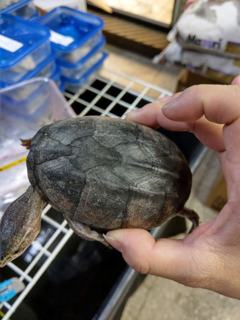 今天進口一批野生果核/三線蛋 (Kinosternon baurii)時,裡面有隻奇怪東西,相信是雜交個體。雖然外貌有點像中美洲巨蛋 (Staurotypus salvinii),但中美洲巨蛋和果核蛋在野外分佈是沒有重疊的,所以估計是果核蛋和麝香/黑蛋 (Sternotherus odoratus)的雜交個體。拍了些照片留個記錄。