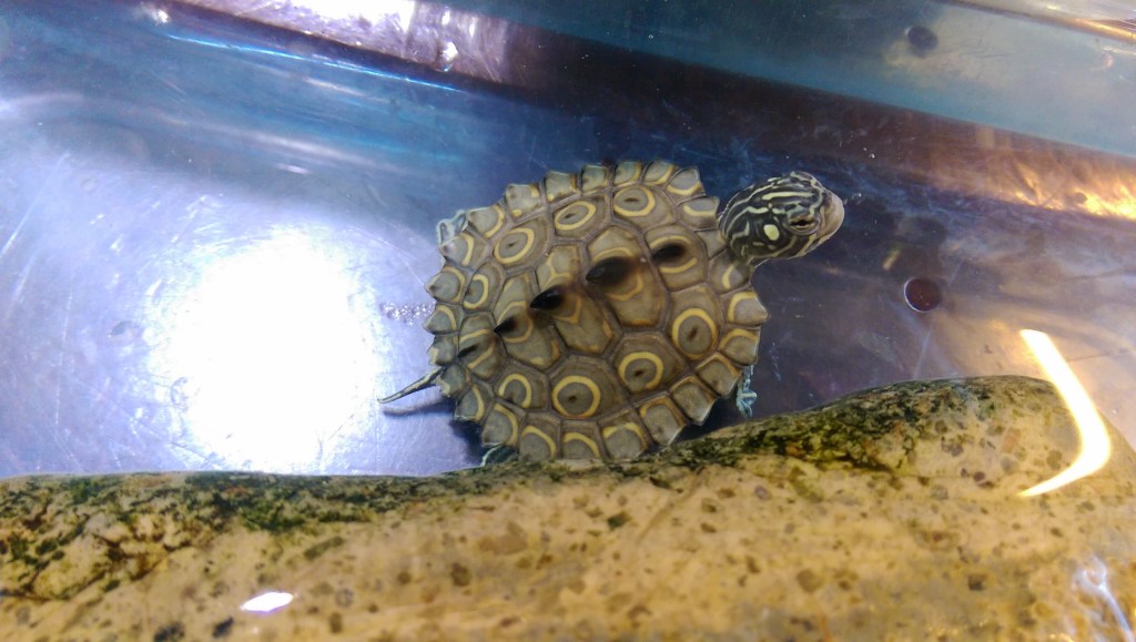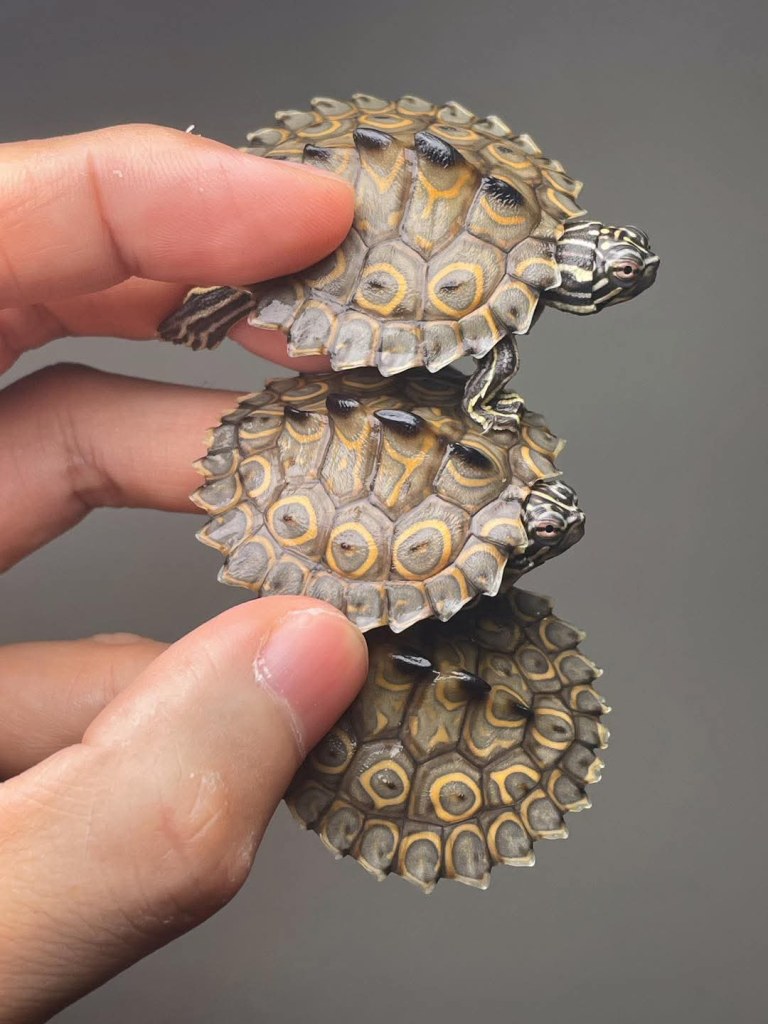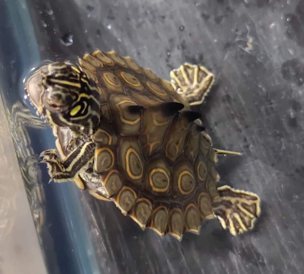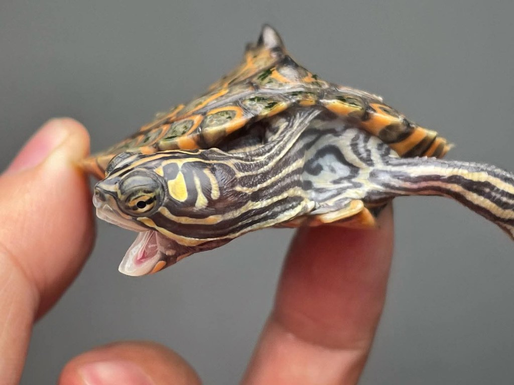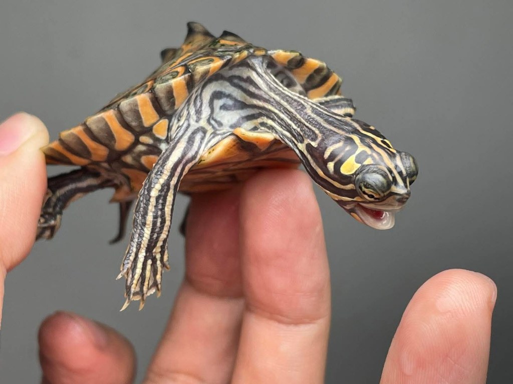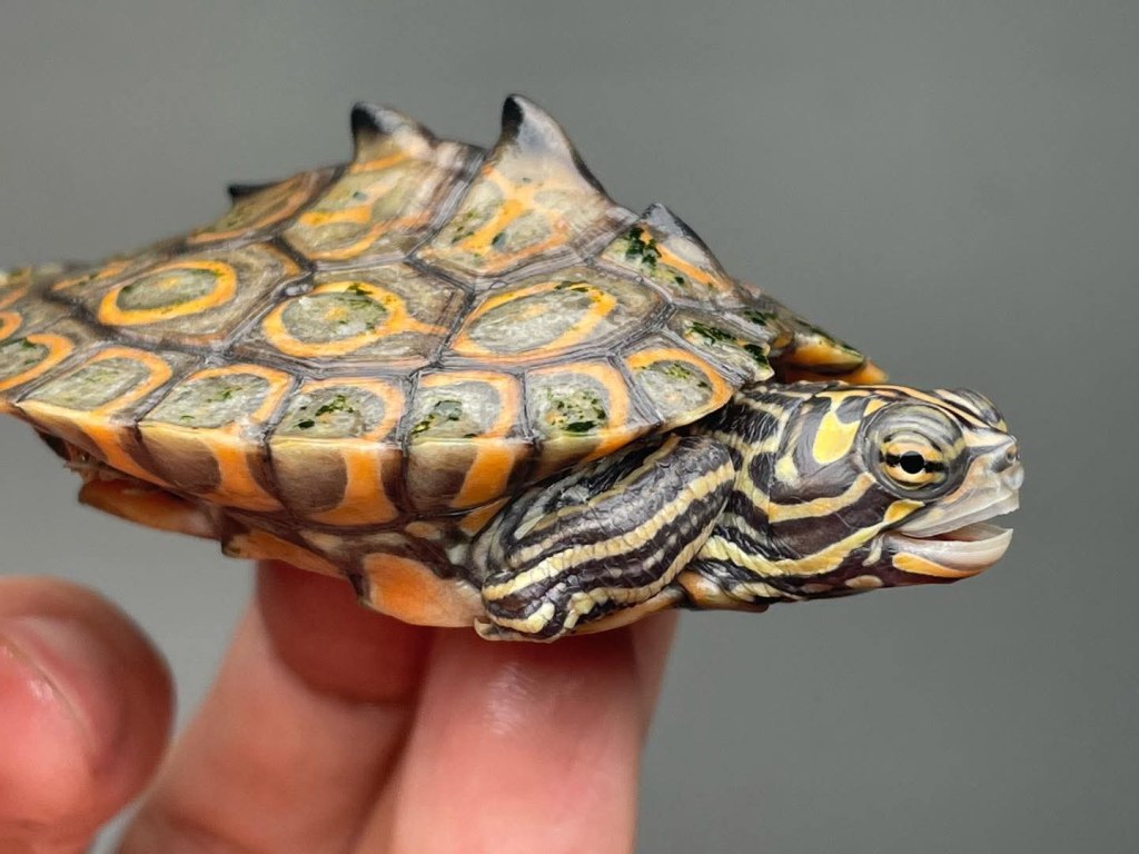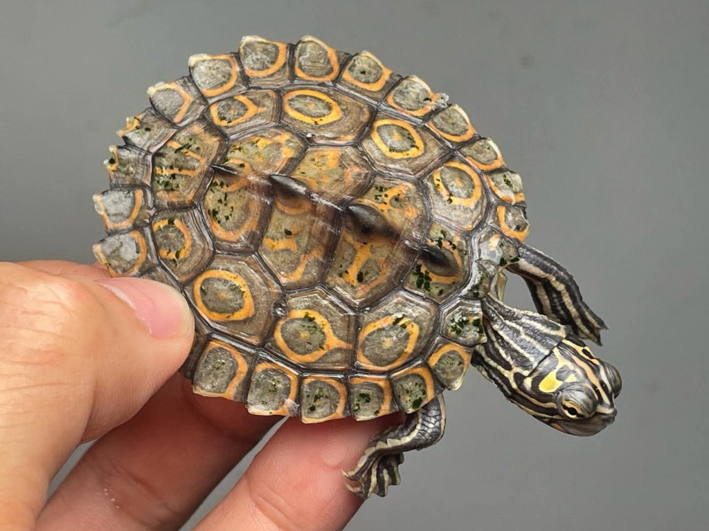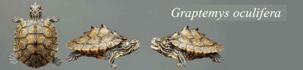 雄龜平均背甲直線長度只有 7-11公分,而雌龜通常不超過22公分,平均 在16公分左右。脊盾上的齒实型瘤狀物非常發達,尤其是第二和第三盾上的。甲殼呈淺至深橄欖綠色,緣盾鋸齒狀亦明顯,主要的識別特徵是每個肋盾上都有一個黃色或橙色的大圓環眼斑,邊緣盾上亦有半圓或條形的花紋。腹甲為黃色,接縫處因個體不同會有或多或少的花紋,但隨著年齡的增長會變得不明顯。皮膚呈黑色,有許多黃色條紋。眼睛後面通常有一對橢圓形亮斑,但有時也會呈長條型,一般對比起黃斑地圖龜下花紋較幼。 一般生活在水流湍急的河流中,這些河道寬闊開揚,底為沙質或粘土。有大量曬太陽的原木、沙洲和灌木叢供龜隻曬太陽。它們花很多時間曬太陽,即使很小隻的幼龜亦然,但牠們亦非常膽小,在野外很難很難在不嚇到它們的情況下接近它們。到了晚上,他們會到睡下睡覺。但有時牠們會選擇留在樹枝上過夜。 雄龜在底甲6.5 公分左右成熟,雌龜大約13 公分。產卵季節通常從 5 月中旬開始到 7 月中旬,6 月中旬是高峰,雌龜於晚間爬上沙洲上下蛋。通常每年僅產 1 窩 ,平均只有 3-4 隻蛋。在 30°C 下孵育需要 63 天