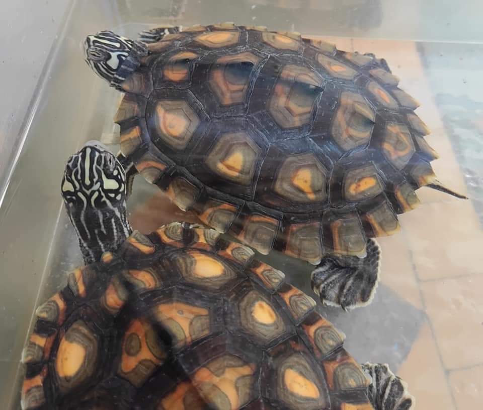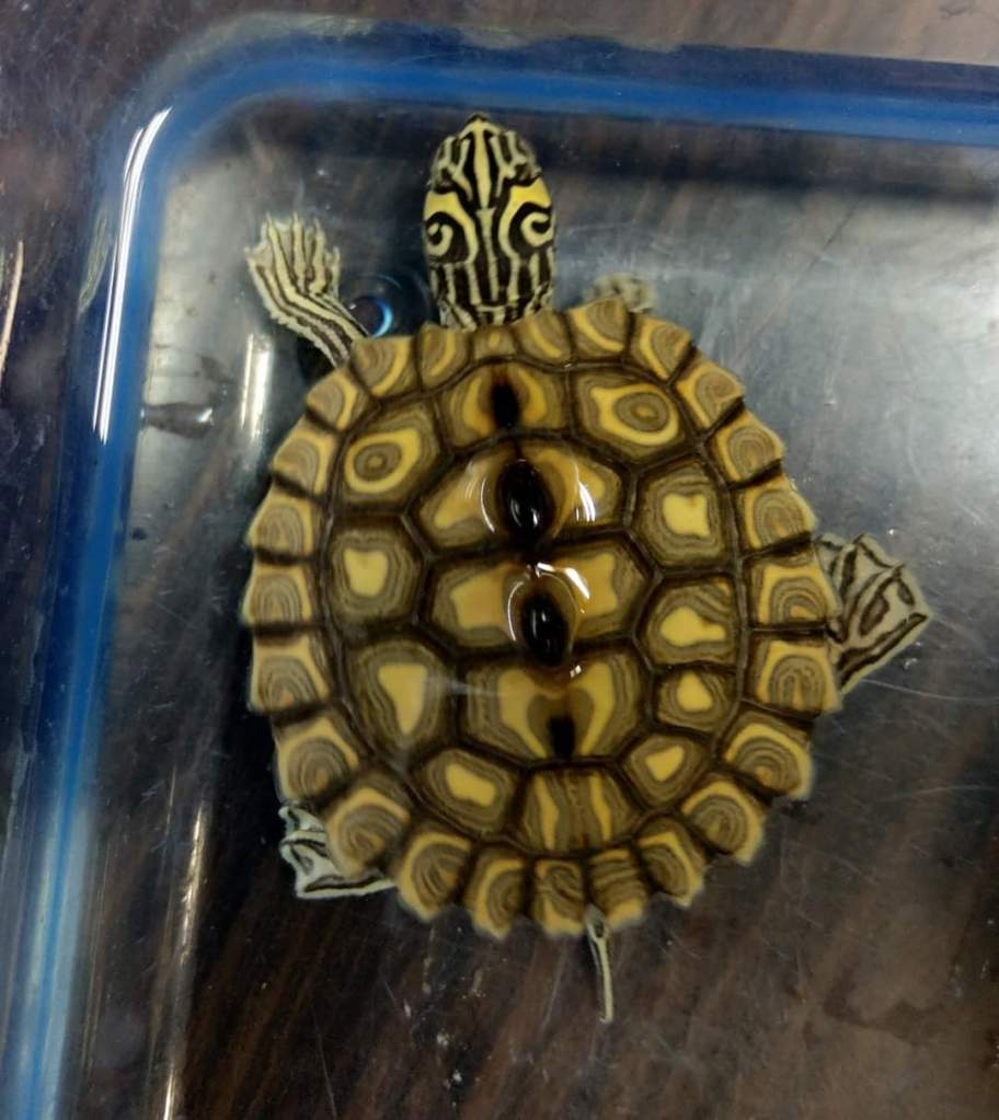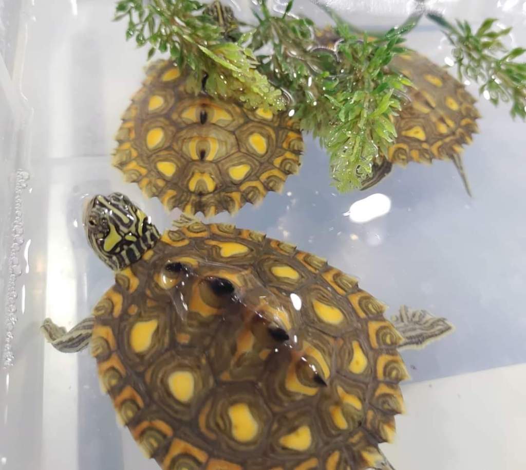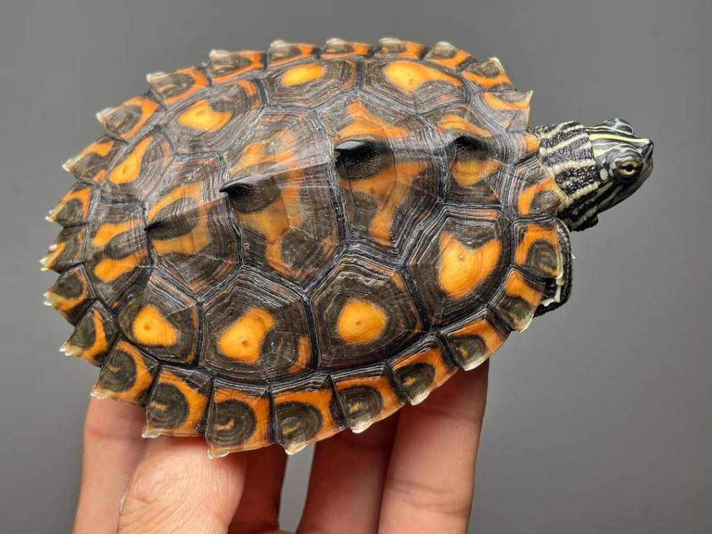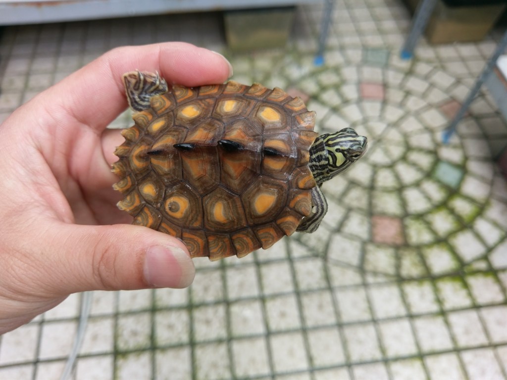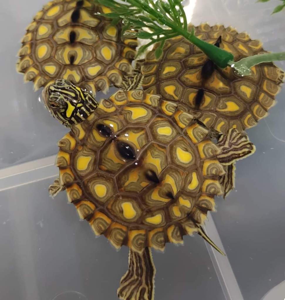 本品種的雄龜大約能長到11公分而雌龜不超過21公分,甲殼呈橄欖色至棕色。 幼龜時期背雖然不如巨頭組地圖龜幼龜般高脊線,但是瘤狀的黑色突起物非常發達,高聳地突起在頭四塊脊盾上,緣盾鋸齒狀亦明顯。 最主要的識別特徵是每個肋盾上有明亮的黃色至橙黃色斑點; 然而,這些標記可能變化很大,有時可能表現出斑點中間破裂成與G. oculifera 有點類似的環狀型甚至新月型。 緣盾上同樣有寬黃色條或半圓形花紋。 這些標記往往會隨著年齡的增長而褪色,尤其是在成年雌龜身上。 腹甲底部呈奶油色至黃色,接縫處有深色圖案,這些花紋多與少變化可以頗大。 但同樣也會隨著年齡的增長而消失。 皮膚呈木炭色或灰黑色至深橄欖色,帶有黃色斑紋。 眼眶後的斑紋呈長方形、圓形或三角形,通常連接一條從眼眶向下延伸到頸部的縱向背側條紋。 從眼睛到鼻子有醒目的眶間條紋。 下巴和喉嚨標有寬闊的縱向條紋和橫向條。 雄性將有更狹長的頭部、前爪更長、比例寬大的尾巴,整體外觀更保留更多幼年時的漂亮特色。 黃斑地圖龜喜歡中大型河流,這些開揚河道可以提供充足的陽光和曬太陽的機會。這些河道水流適中只是偶然會有急流,通常充斥大量的障礙物、灌木和用於曬太陽的原木,這些河流的底部由粘土、沙子和/或礫石組成。龜群會用很多時間在曬太陽,幾乎是整個白天,有時它們會爬到距水面上3-4米的高度為了更好的獲得日光,即使在下雨或氣溫低(低於攝氏4度)的時候也會見到牠們出來曬太陽,它們主要吃昆蟲幼蟲和水生軟體動物,而從檢測中也發現過其胃中有藻類,估計是進食長在藻上的無脊椎生物時同時被攝食下。 求偶期通常發生在春天,行為與其他地圖龜行為雷同,雄性的性成熟非常早,可能在三歲時便達到(大約6-7公分)。雌龜一般於15公分左右達成熟。