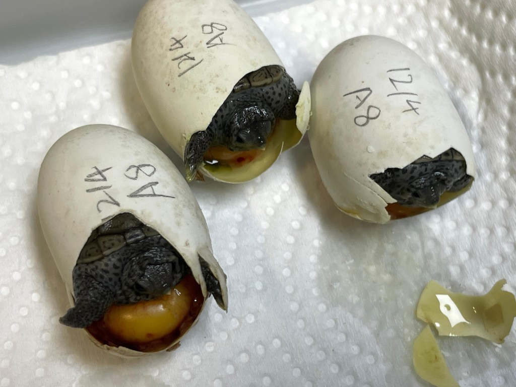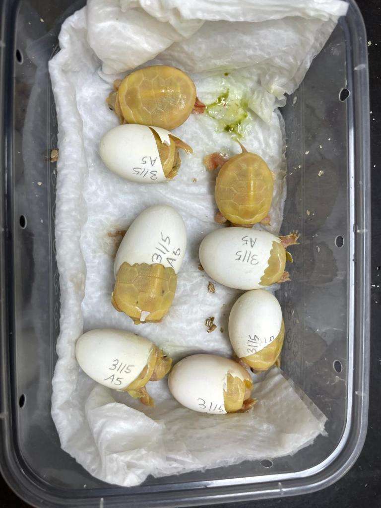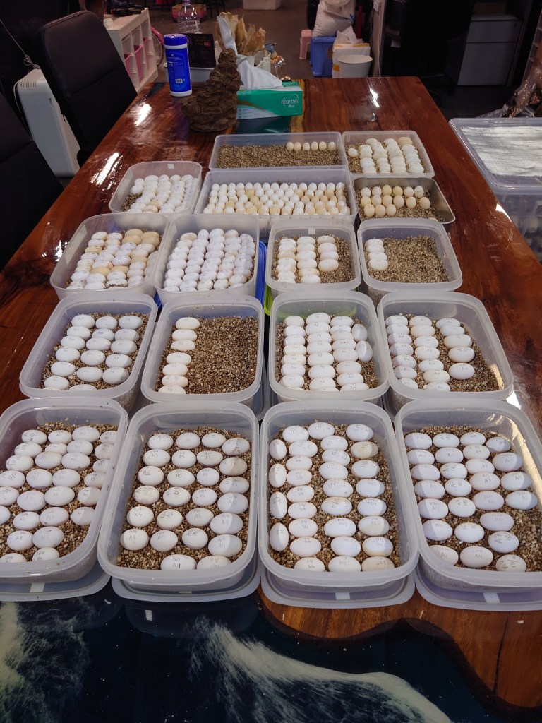 今年我們的繁殖結果比過往任何一年都好,單是我們飼養在香港的爬寵生蛋數量已經比上年高出23.4%,合共收了2547粒蛋。授精比率亦比往年高出10.5%達至58.2%,一共有1483粒授精蛋。我們的繁殖基地成功孕育出902條小生命。當中包括206隻二級瀕危物種,當中有各個亞種的鑽紋龜合共144隻,不同的地圖龜種32隻,蛋龜13隻,還有三類瀕危龜種30隻。同時龜仔樂園不只有龜,我們也繁殖出48條蜥蜴。